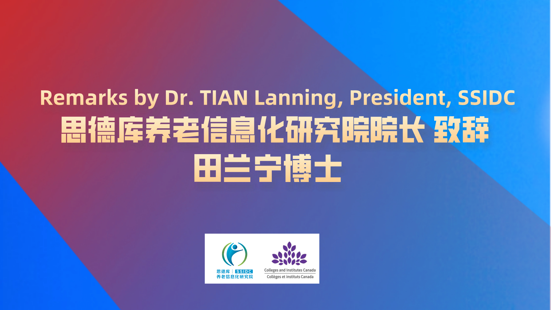 思德库养老信息化研究院与加拿大应用技术与职业学院协会战略合作协议签约仪式在线举办,思德库创始人田兰宁博士发表讲话。