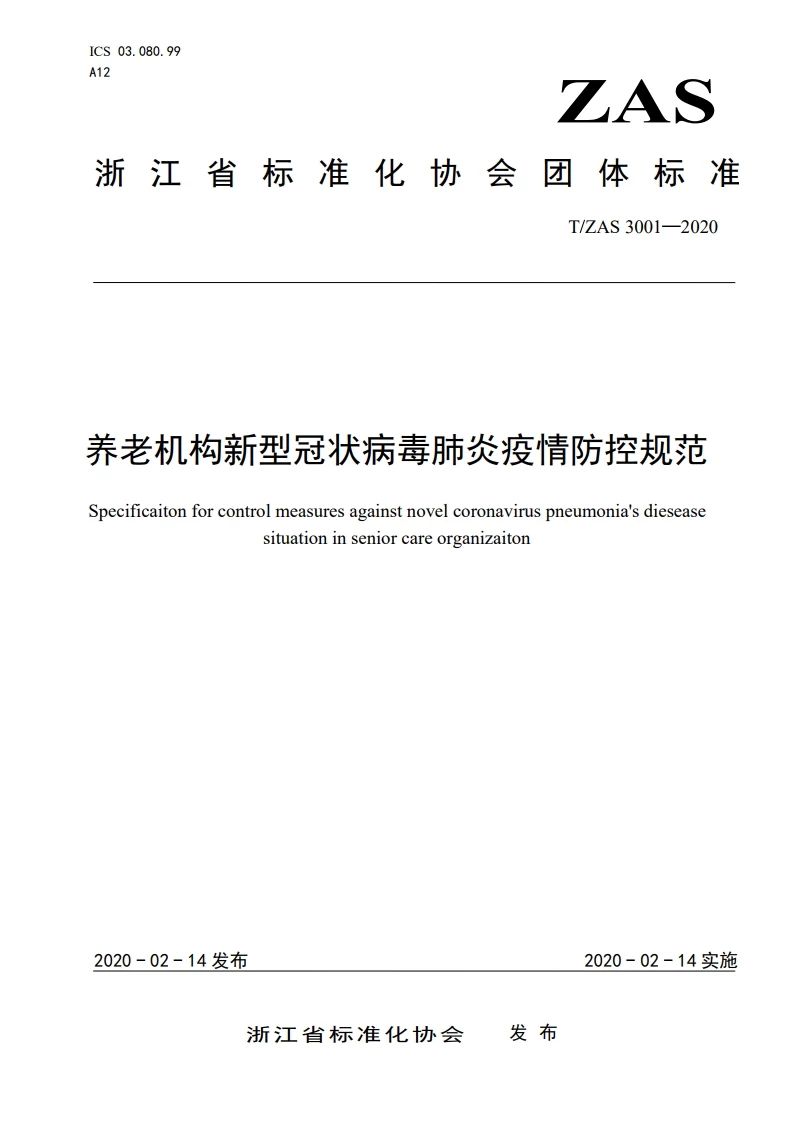 2月14日,浙江省标准化协会《养老机构新型冠状病毒肺炎疫情防控规范》(T/ZAS 3001—2020)团体标准正式发布!该标准的发布实施为养老机构在新冠肺炎疫情期间防控工作提供了有力的技术支持,进一步防止和降低感染发生,保障老年人在养老机构健康养老。