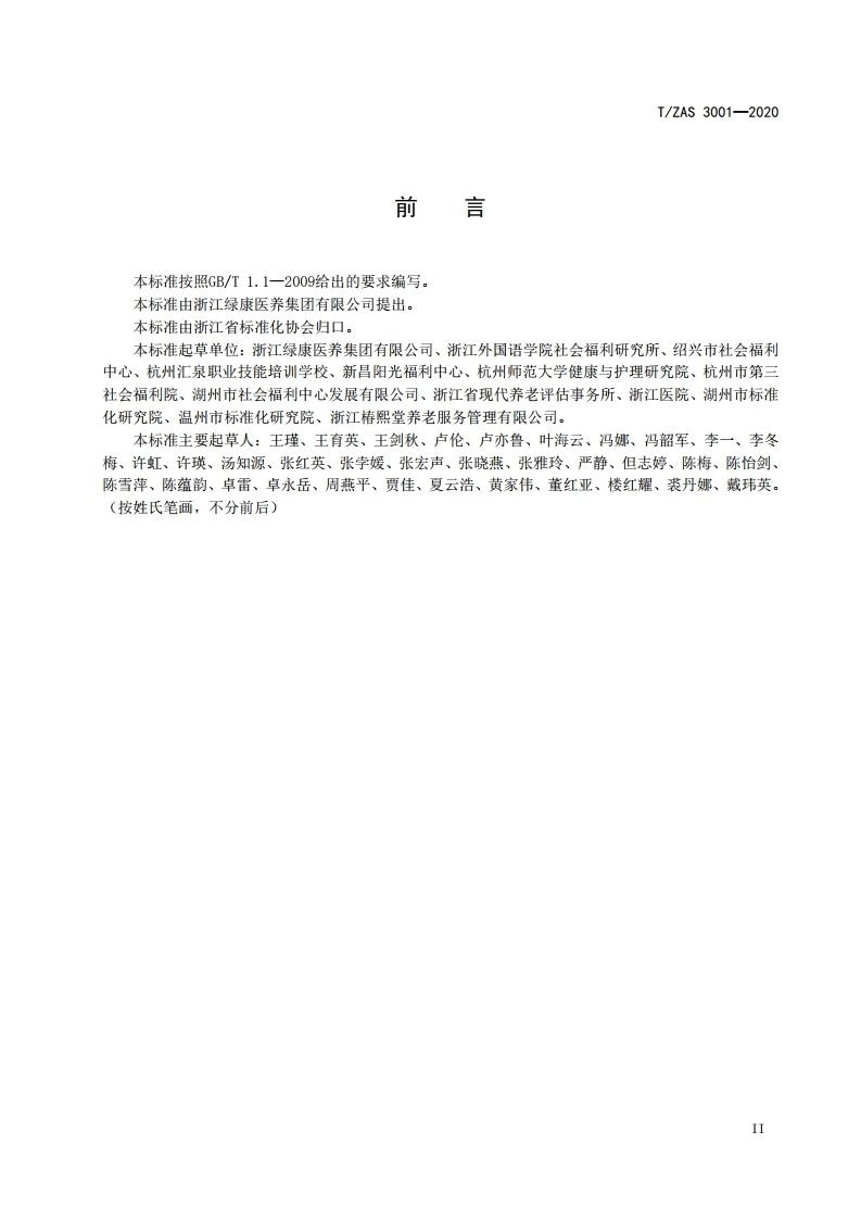 该标准的顺利发布实施,凝聚了浙江省民政厅养老处、浙江省社会养老服务标准化技术委员会、浙江中医药大学护理学院、绍兴市社会福利院、义乌市稠江老年养护院、宁波颐乐园、安吉县社会福利中心、浙江绿康医养集团有限公司、浙江外国语学院社会福利研究所、绍兴市社会福利中心、杭州汇泉职业技能培训学校、新昌阳光福利中心、杭州师范大学健康与护理研究院、杭州市第三社会福利院、湖州市社会福利中心发展有限公司、浙江省现代养老评估事务所、浙江医院、湖州市标准化研究院、温州市标准化研究院、浙江椿熙堂养老服务管理有限公司等20家单位的41名专家的知识和智慧。